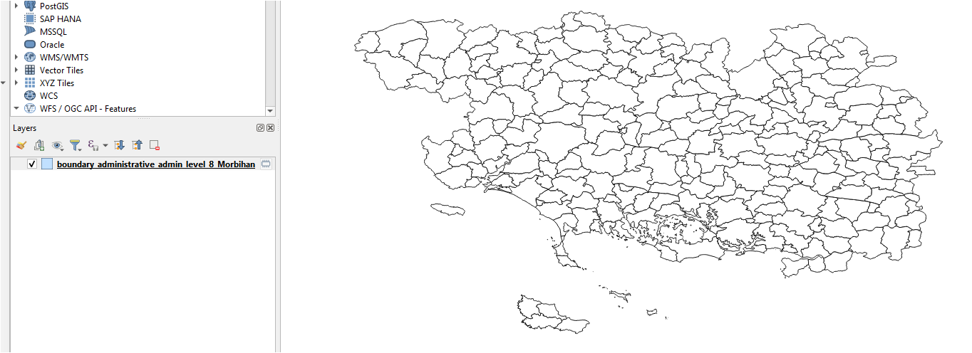 Ainsi, en quelques secondes, vous obtiendrez l’ensemble des communes du Morbihan prêtes à l’emploi dans QGIS.